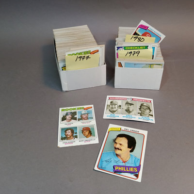 Topps Baseball trading cards from 1977, 1979, and 1980 in two boxes. Uncounted/unsorted, may not include entire series, but will contain duplicates. 1977 Gaylord Perry card printed by O-Pee-Chee, printed in Canada. Condition varies, from bent corners to like-new on visible examination. 2 boxes.