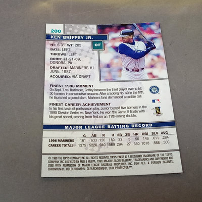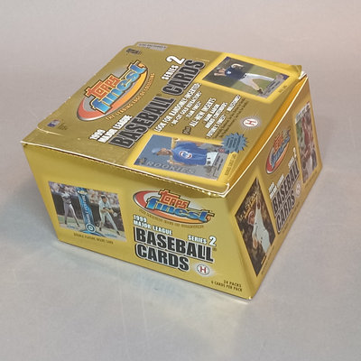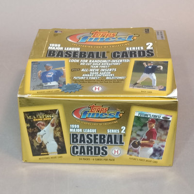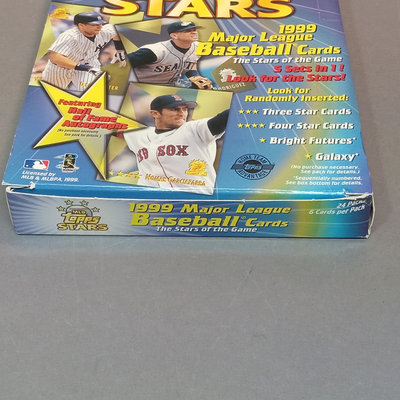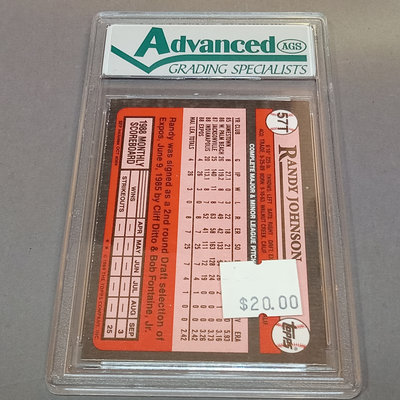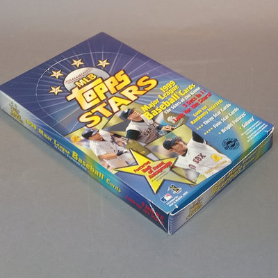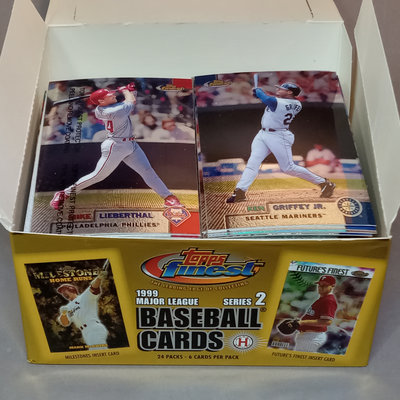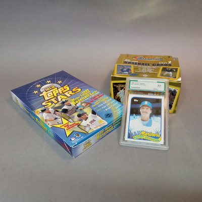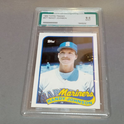 1989 Topps Traded #57T Randy Johnson encased card, graded 9.0 mint. Topps 1999 Finest Major League Series 2 and 1999 Major League Stars collectable baseball trading cards in counter display box with many (uncounted) unsorted cards. 3 plus pieces.