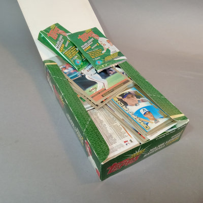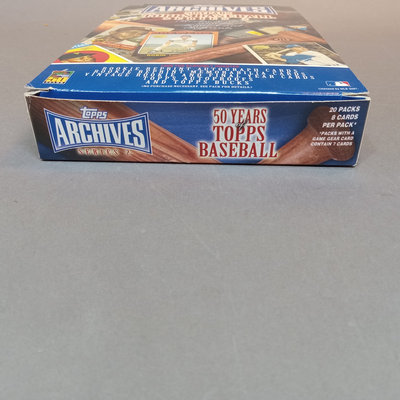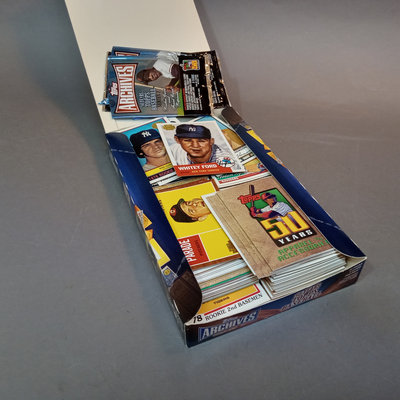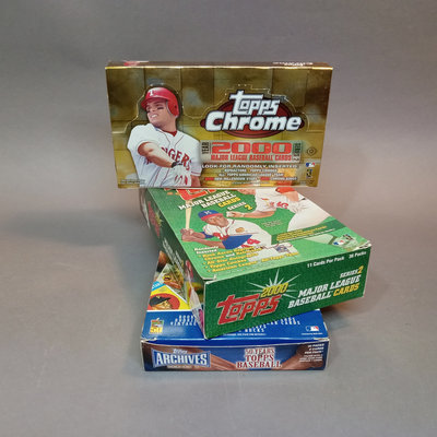 Topps Chrome 2000 Major League Baseball, 2000 Series 2 Major League Baseball, and Archives Series 2: 50 Years of Topps collectable baseball trading cards in counter display box with many (uncounted) unsorted cards. 3 boxes.