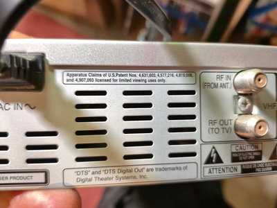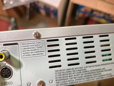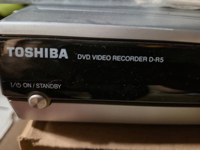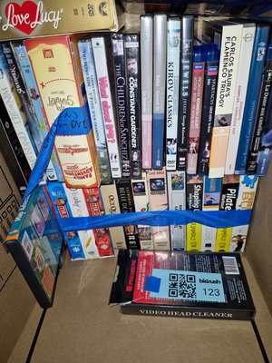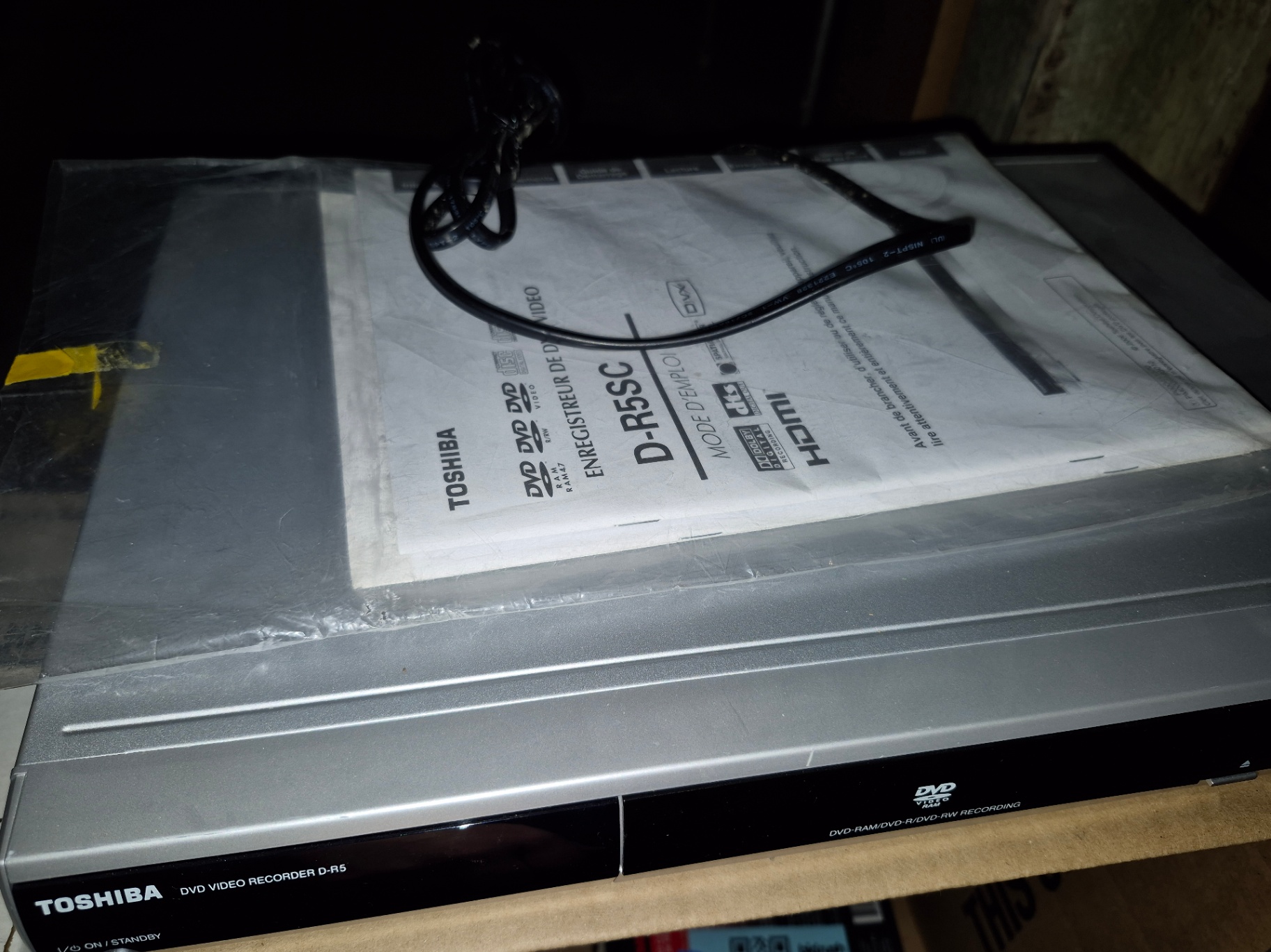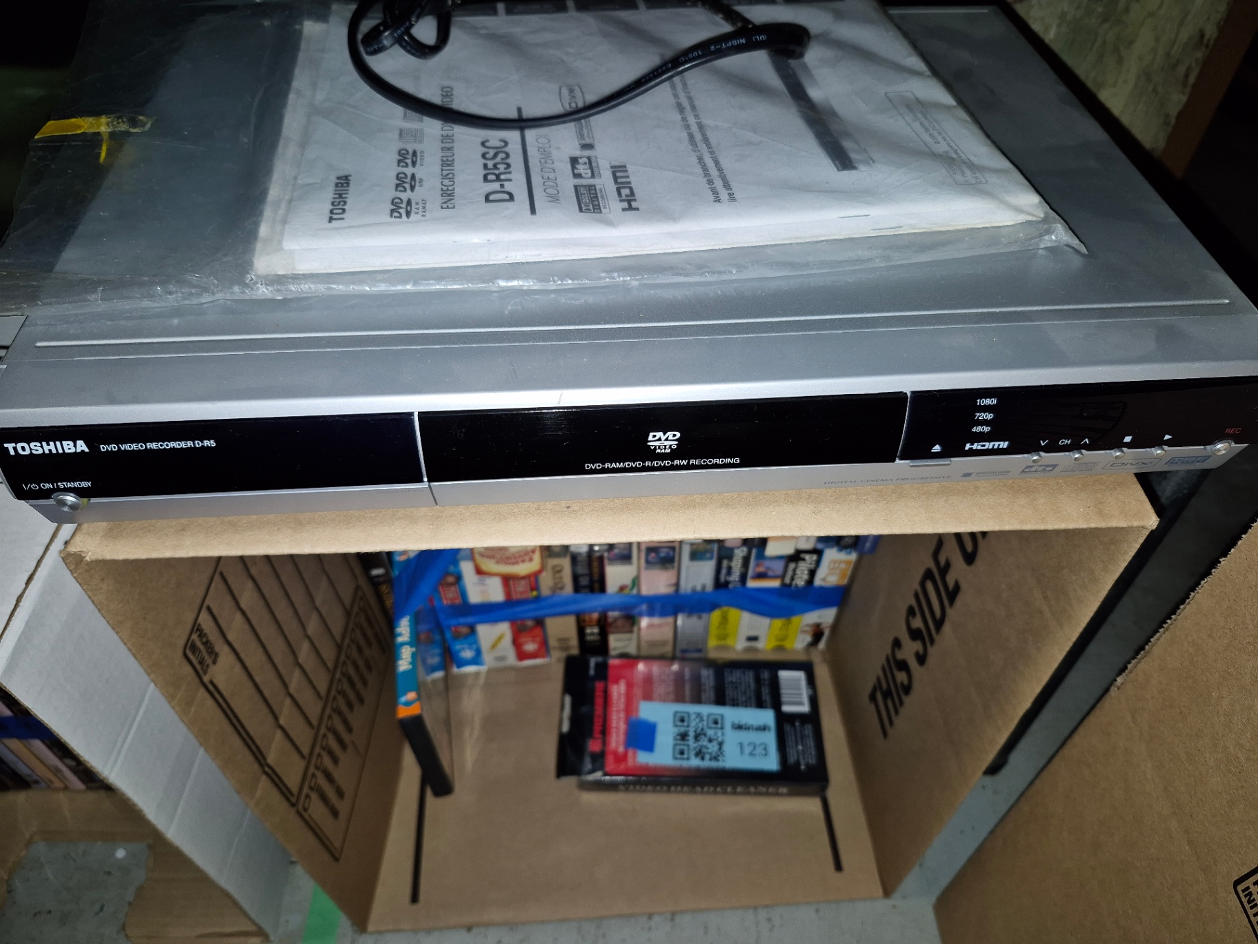 A Toshiba DVD video recorder alongside a large collection of DVD cases and a video head cleaner box, with cables and related accessories.