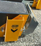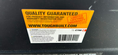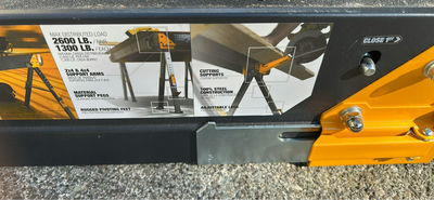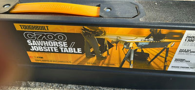 A pair of ToughBuilt adjustable metal sawhorses featuring integrated cutting supports, adjustable legs, and support arms for 2x4 and 4x4 lumber, with a maximum distributed load rating of 1300 lb per sawhorse.