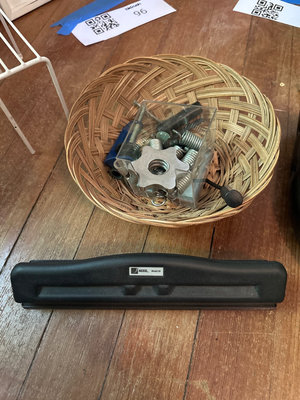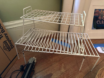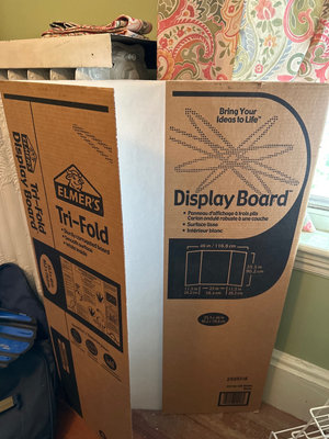 Two Elmer's Tri-Fold Display Boards, white wire shelving racks, a black desk lamp, a wicker basket containing assorted hardware (nuts, bolts, screws, knobs), a clear container with fasteners, and several binders/folders in red, blue, and black. Three hole paper puncher and bin of desk top supplies.