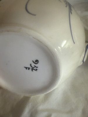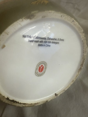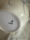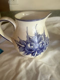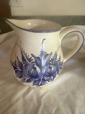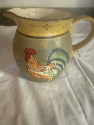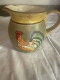 A pair of ceramic pitchers: one white with blue floral motifs and a blue rim, and another olive-green with a rooster design and yellow accent rim; both have handles and pouring spouts. The bases show maker marks and a 'Made in China' designation.