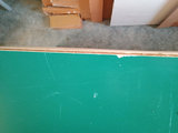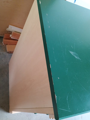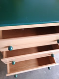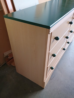 A light-colored dresser with a green top and six drawers arranged in two columns, each drawer fitted with a green round knob. Material is pressboard. 53 in wide by 18 in deep and 30 in tall, matches the desk in Lot #4.