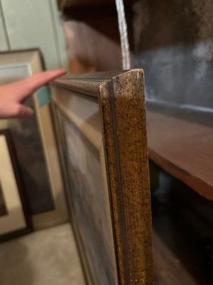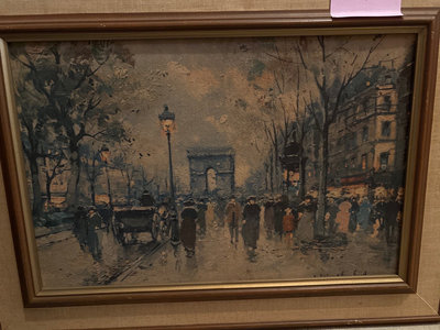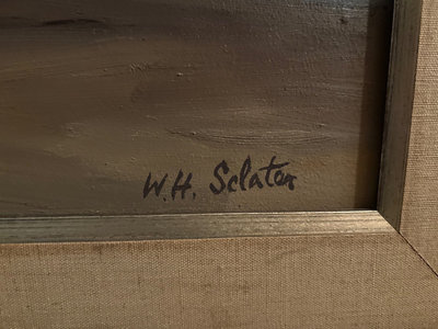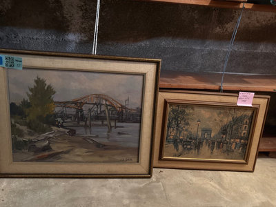 A pair of framed art pieces, one painting signed by W. H. Sclater, featuring a riverside scene with a bridge and a second reproduction of Parisian street scene.