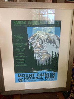 Two framed posters from the Ranger Naturalist Service depicting Yellowstone National Park and Mount Rainier National Park.