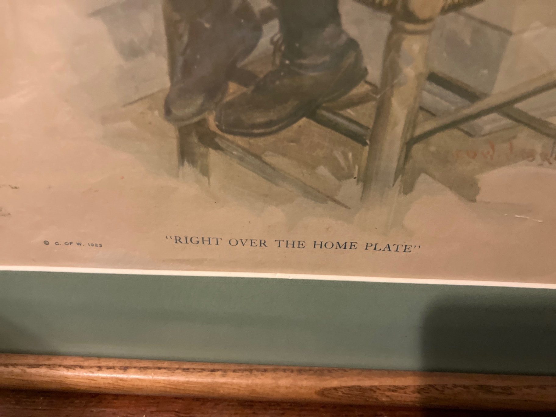 Two vintage framed prints featuring advertising art. One is a James Montgomery Flagg illustration for Cream of Wheat with the caption 'Cream of Wheat is Ready' showing a person at a table; the other depicts a woman with a child by a railing. Both are set in wooden frames, with one having a light mat.