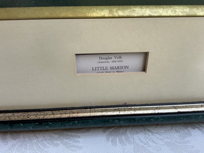 The one on the left, does not have glass, it is a very old litho on cardboard of a James Guthrie painting of a girl tending a flock of Geese, 1883, original price tag is $110, 32” x 24”. The second is titled ‘Little Marion’, by Douglas Volk, 24” Square.