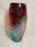Two glass artworks: a tall gradient vase featuring red, orange, blue, and textured patches 16”, and a teardrop-shaped sculpture with red, blue, white, and yellow swirls and embedded bubbles.
