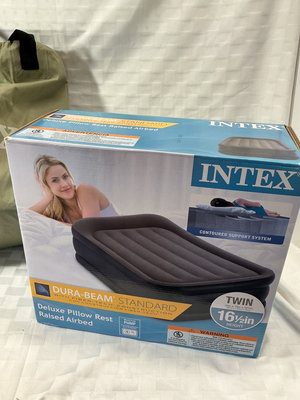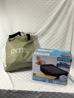 Twin-size inflatable Intex Dura-Beam Deluxe Pillow Rest Raised Airbed with Carrying Bag and Box with a built-in pillow rest and raised design. Includes second in tax air mattress that looks unused