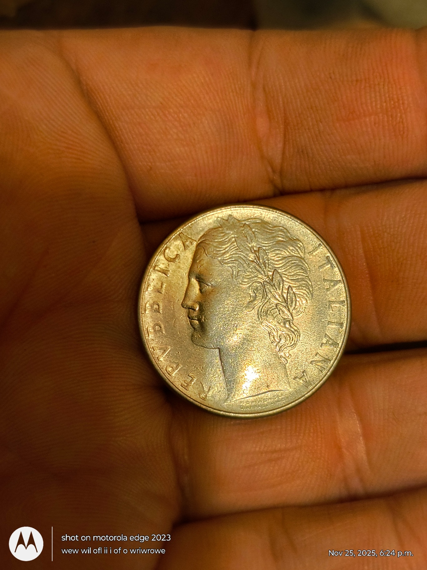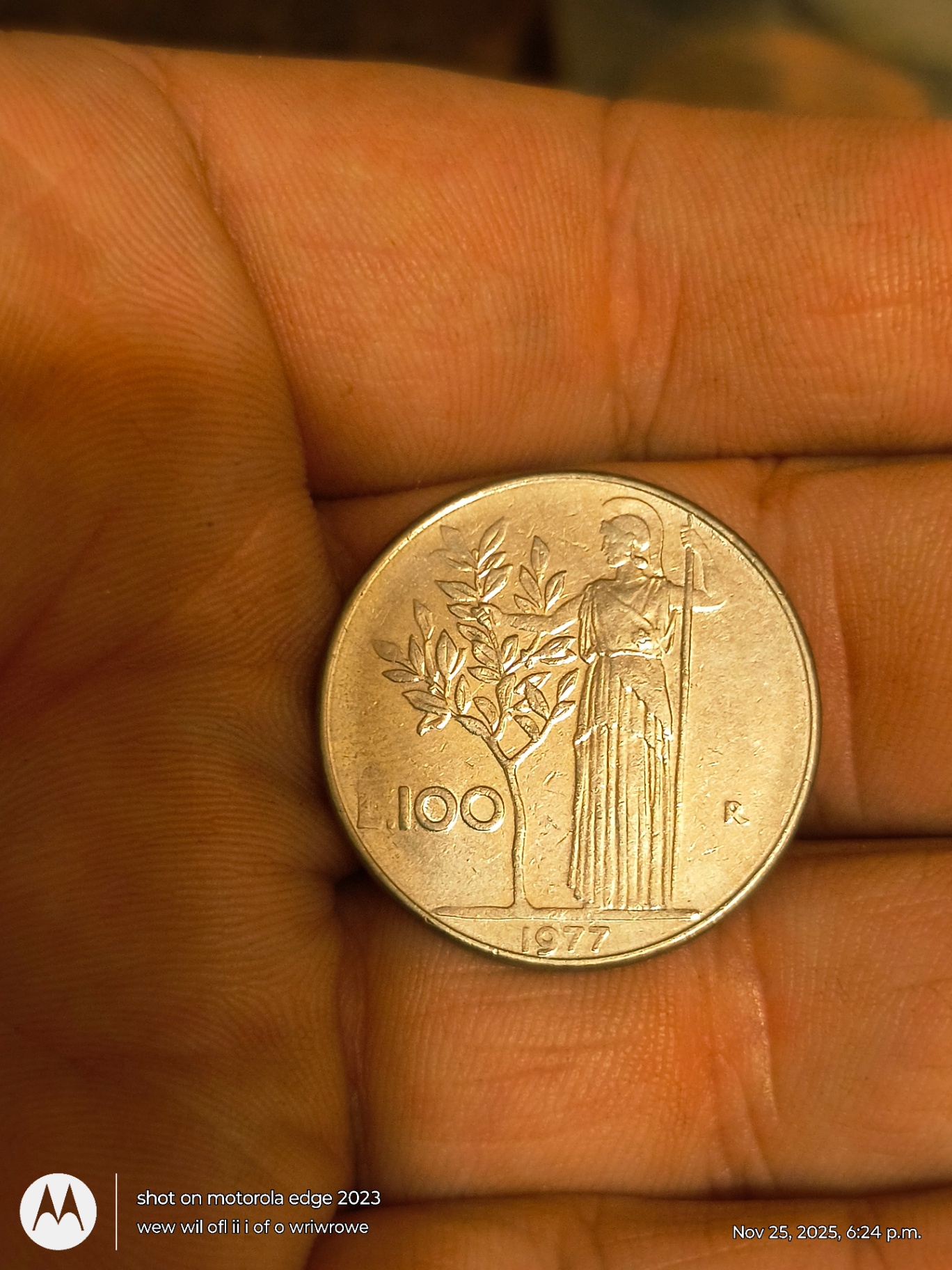 Two coins held between fingers. One coin features a female portrait with the inscription REPUBBLICA ITALIANA around the edge. The other coin shows a standing figure beside a small tree, with the denomination 100 and the year 1977.