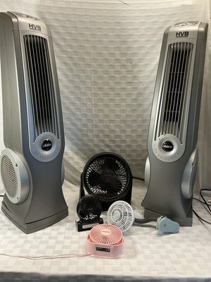 A collection of electric fans including two tall Lasko high-velocity tower fans (HVB), a black Holmes compact desk fan, a pink usb portable desk fan, a gray flexible gooseneck clip-on fan battery operated, a small black battery operated fan. Plug in fans were tested.