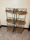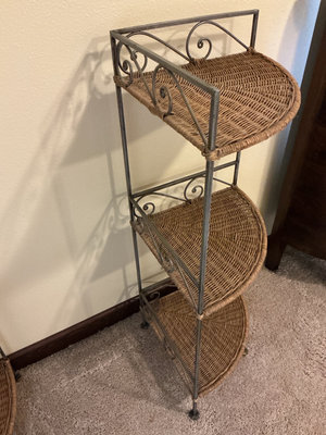 Two metal-framed corner shelving units with three wicker shelves on each, featuring decorative scrollwork on the metal frame. 36 inches tall and each side comes out from the corner 13 inches