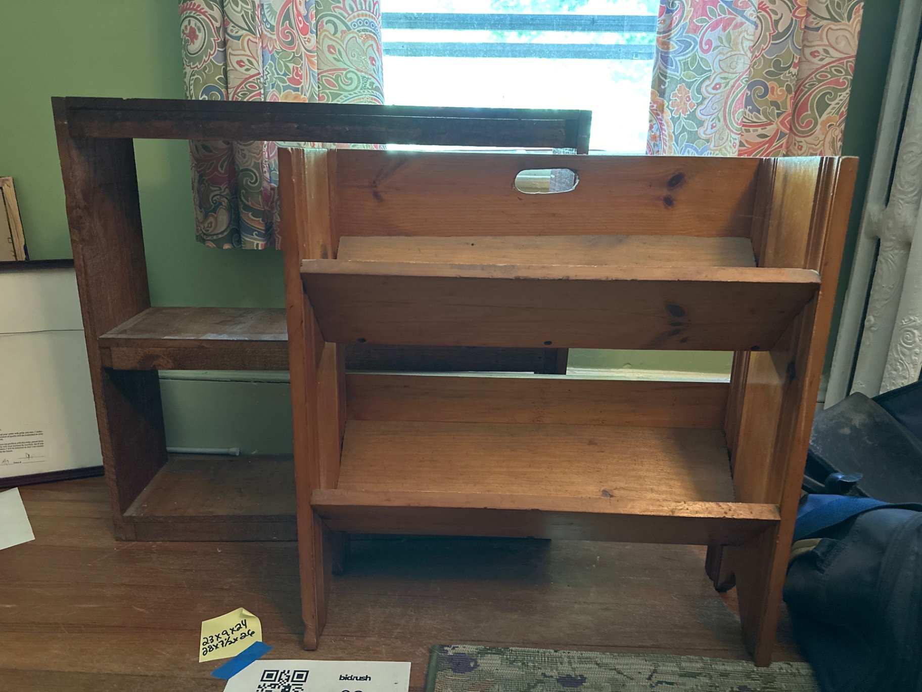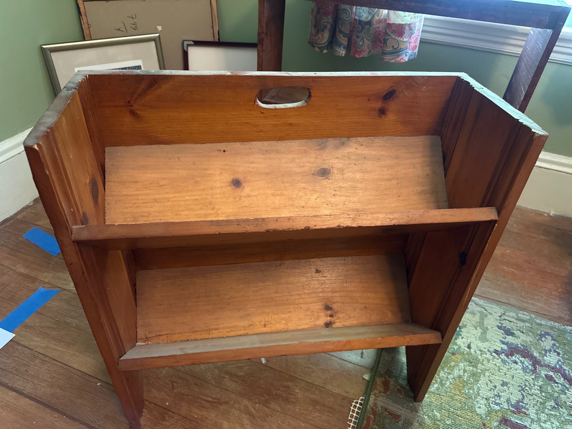 A small rustic wooden storage unit with two open shelves, thick side panels, and a cutout handle in the back panel, showing wear consistent with age. Rustic open shelves bookcase.