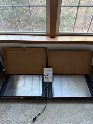 Two stainless steel electric warming trays in their original boxes with power cords. Each tray measures approximately 25.25 x 14 inches and is noted as not tested.