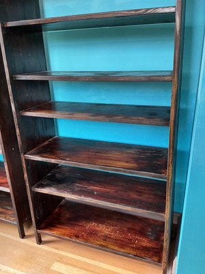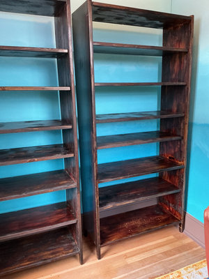 Two tall dark wooden bookcases with multiple shelves. Distressed style stain. Some scratches on some of the shelf surfaces. These are a little bit wobbly, which could be fixed with a backing. Shelves are adjustable. Measurements are 38.5 inches wide by 16 inches deep and 83 inches tall.