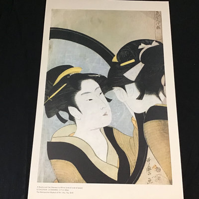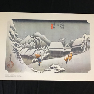 Japanese Prints: Eight Reproductions, from the Metropolitan Museum of Art, includes Harunobu, Hiroshige, Hokusai, Shunsho, Sharuku, and Utamaro, 17x11. Utagawa Hiroshige "Sumida River" woodblock print, 9.25x7. Korin Ogata "Cranes in the Marsh" woodblock print on gold background, 11.75x10. 3 pieces.
