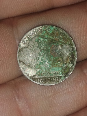 A United States five-cent coin ( nickel) featuring the obverse portrait of Thomas Jefferson and the reverse Monticello, with green patina covering parts of the surface.