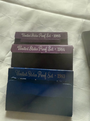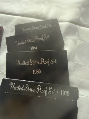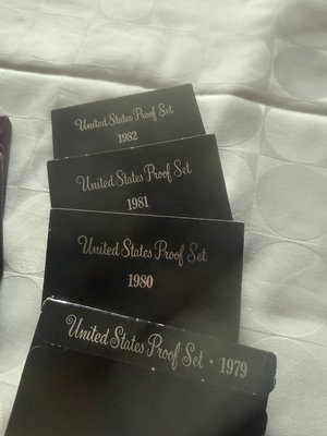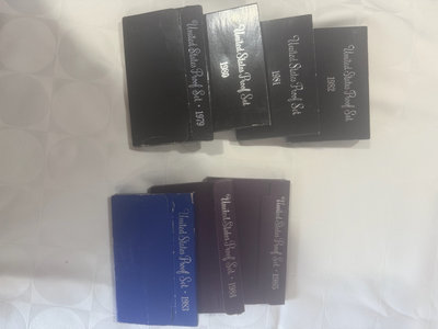 A collection of United States Proof Set coin boxes dating from 1979 to 1985, featuring black boxes with year labels and a few blue and purple packaging accents.