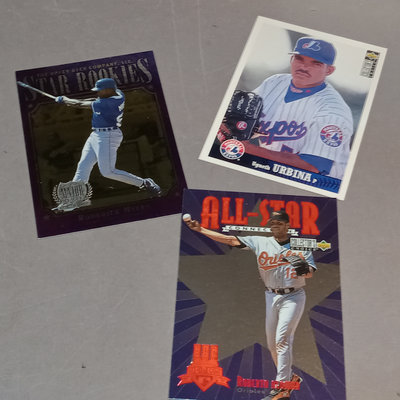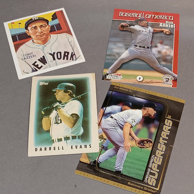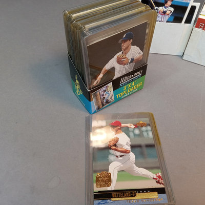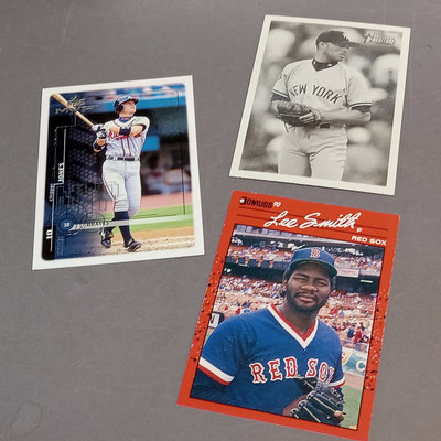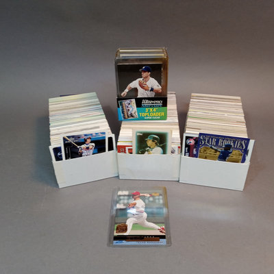 Unsorted and uncounted, may include cards from Topps, Fleer, Upper Deck, Score, Don Russ, Bowman, Pinnacle, and more, from the 1980s to 2000s. Three full card boxes plus one box of 25 encased cards. Condition varies, from bent corners to like-new on visible examination. 4 pieces.
