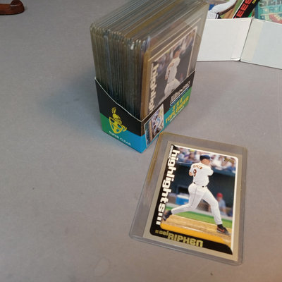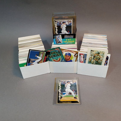 Unsorted and uncounted, may include cards from Topps, Fleer, Upper Deck, Score, Don Russ, Bowman, Pinnacle, and more, from the 1980s to 2000s. Three full card boxes plus one box of 25 encased cards. Condition varies, from bent corners to like-new on visible examination. 4 pieces.