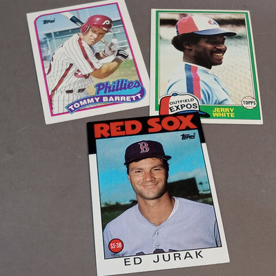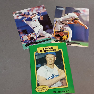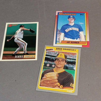 Unsorted and uncounted, may include cards from Topps, Fleer, Upper Deck, Score, Don Russ, Bowman, Pinnacle, and more, from the 1980s to 2000s. Three full card boxes plus one box of 25 encased cards. Condition varies, from bent corners to like-new on visible examination. 4 pieces.
