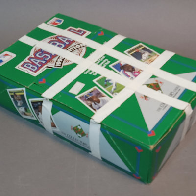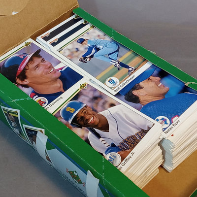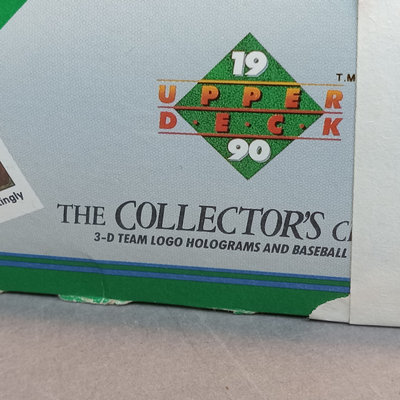 Upper Deck 1990 baseball trading cards, uncounted/unsorted with duplicates and hologram stickers, in a counter display box. 1 box.