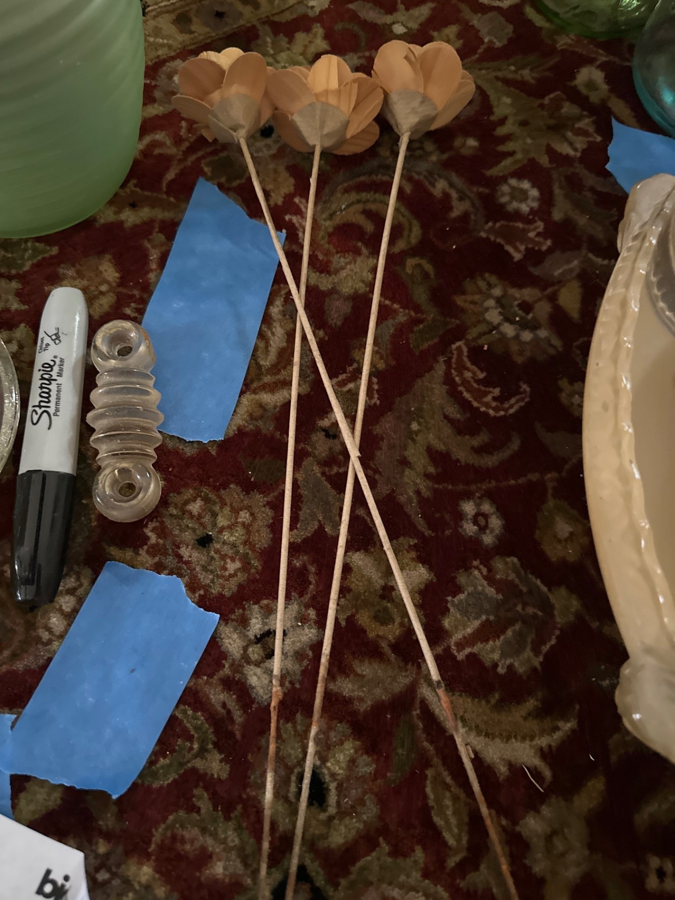 Uranium frosted glass vase with wooden flower picks, a clear circular floral frog, a ribbed clear glass piece.