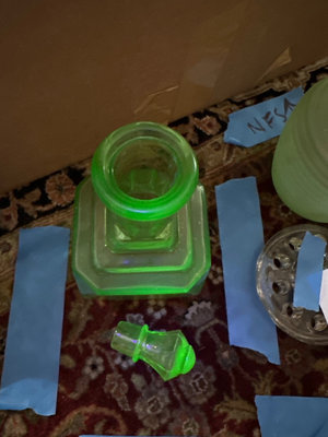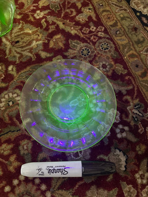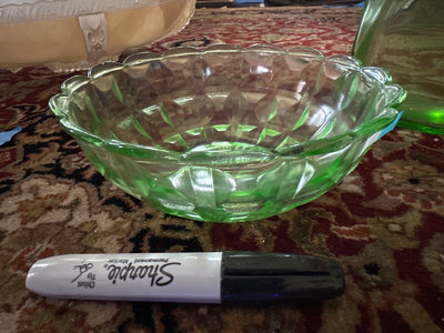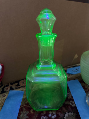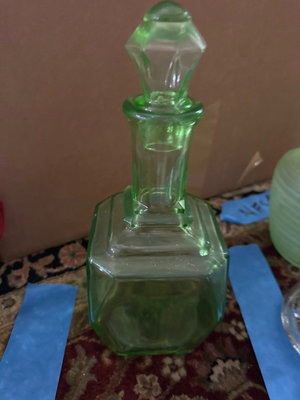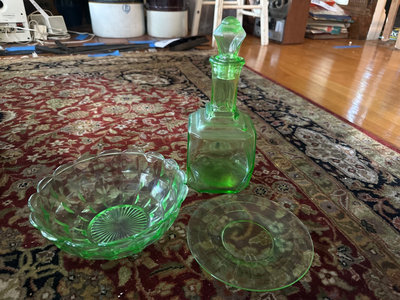 Uranium glass decanter with stopper, a faceted green glass bowl, and a round decorative plate.