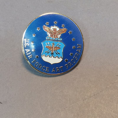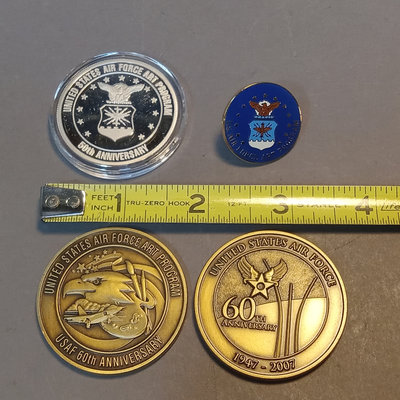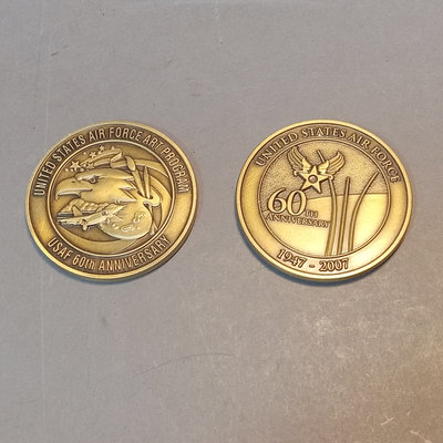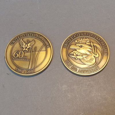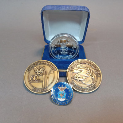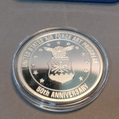 United States Air Force History Through Art 1950-2000/US Air Force Art Program 50th Anniversary, stamped One Troy OZ .999 FS on the side, encased and in display case. US Air Force Art Program 60th Anniversary bronze coins. US AFAP lapel pin. 4 pieces.