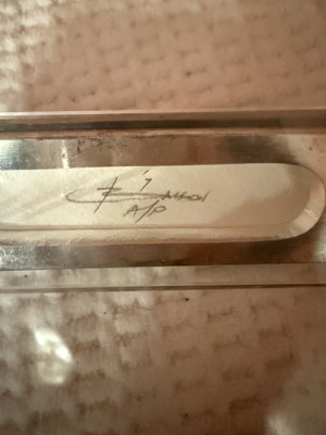 A vertical metal-framed panel featuring a colorful abstract stained glass inset with angular shapes in multiple colors. The brushed metal frame has a top border with rounded cutouts and a small engraved signature on the lower bar.