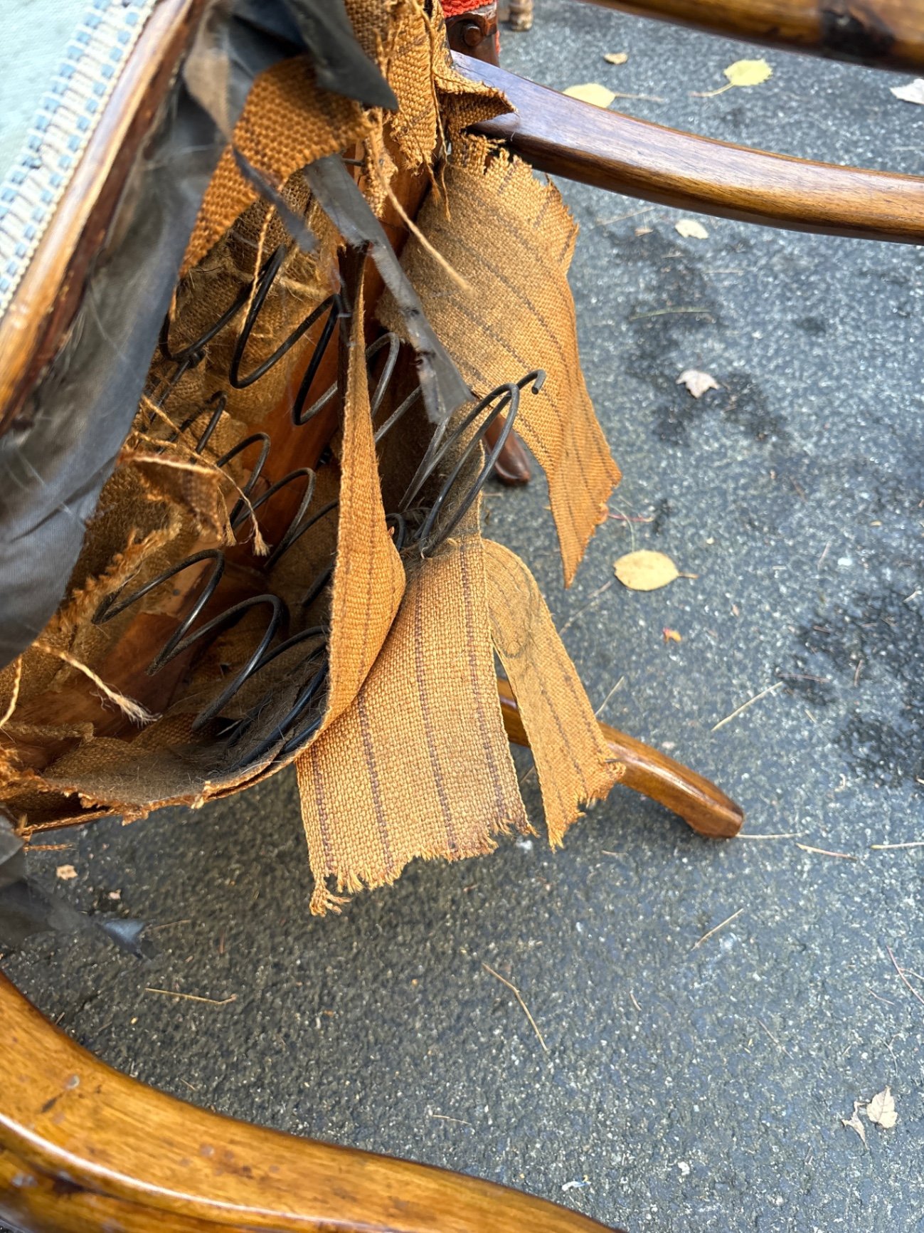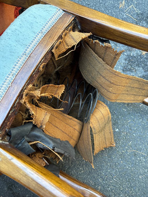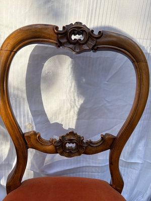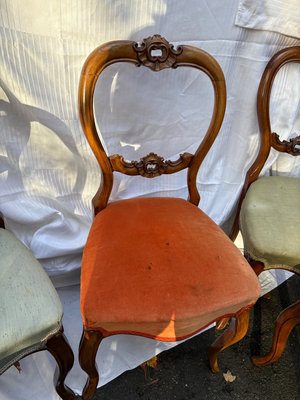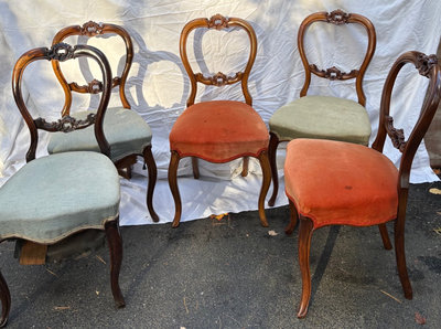 5 dining chairs, the dark one has not been stripped of stain, others are a light rich color. These chairs were the quintessential symbol of the Victorian era from 1830s to the end of the 19th century . Needs new upholstery , and two need the seats redone , springs popping . use an update .