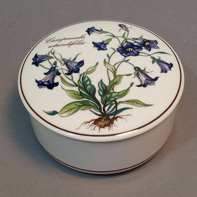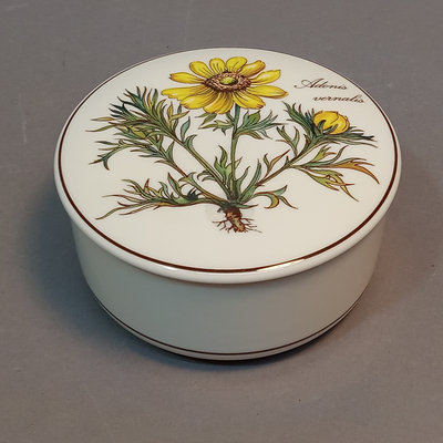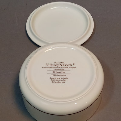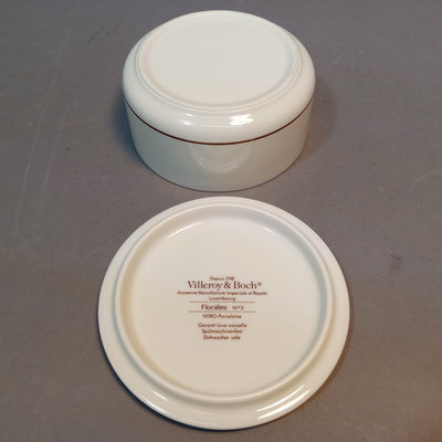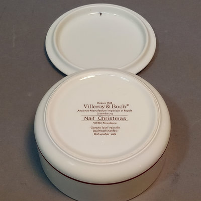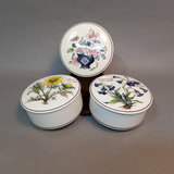 Villeroy & Boch porcelain trinket boxes, made in Luxembourg. Floralies No. 3, Botanica, and Naif Christmas, 4d x 2h. 3 pieces.