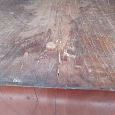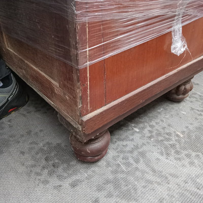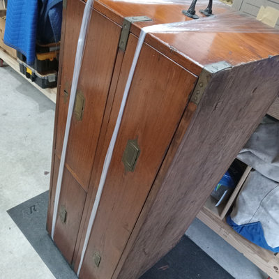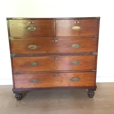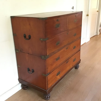 2-Piece 4-drawer campaign style chest with brass inlaid pulls and unique metal handles on the sides. Front feet are different from back, possibly added to create a base for the bottom chest. Attach with pegs to hold them in place. Mild scratches on top, consistent with age and use. 42x19.5x41.5. No makers marks. Heavy, bring help and appropriate vehicle to pickup. 1 piece.