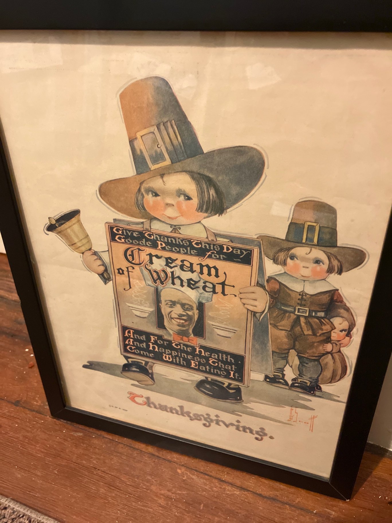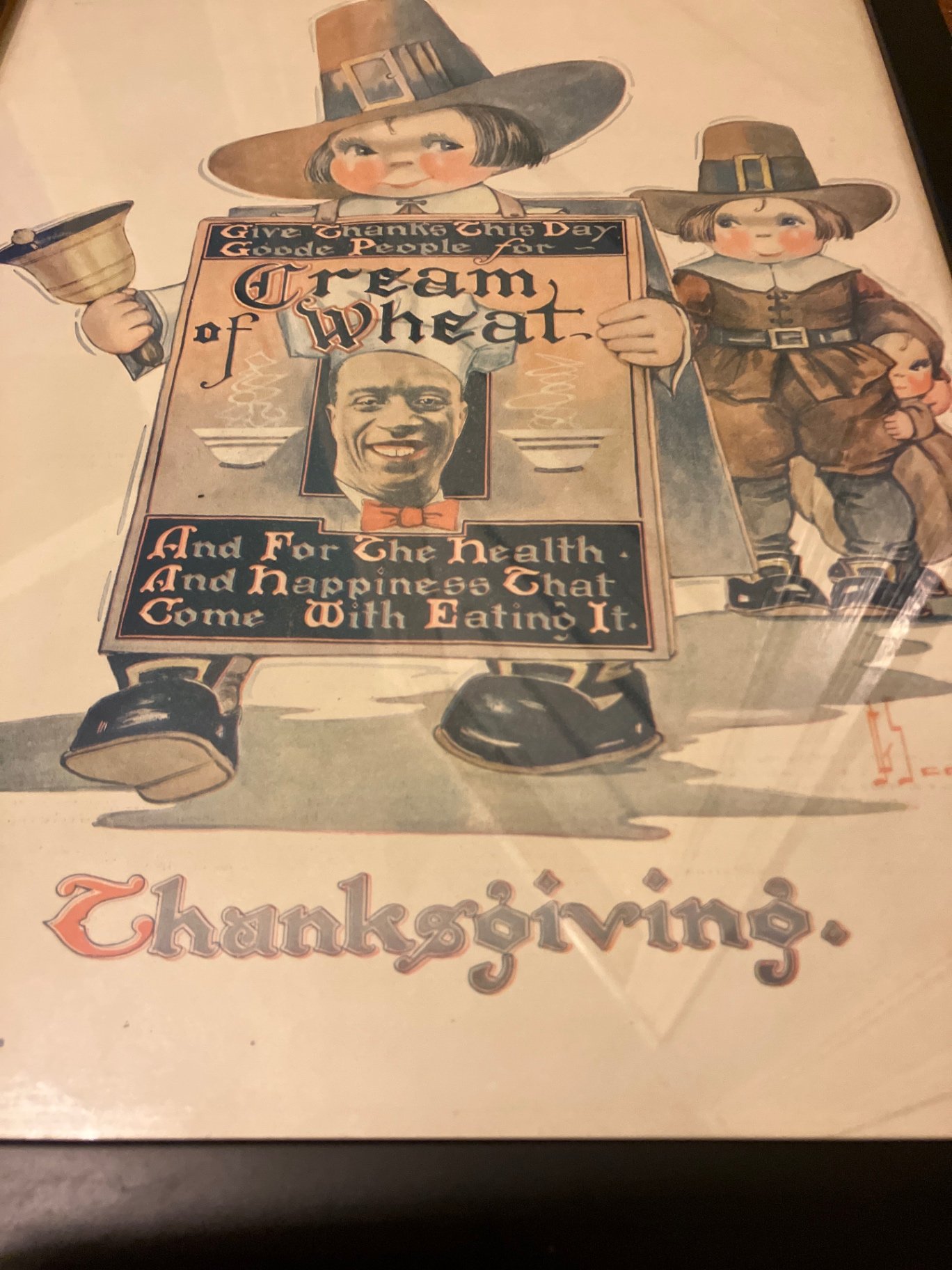 vintage framed prints featuring Cream of Wheat promotional scenes and a 'The World’s Fare' globe-themed illustration with food and characters.