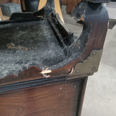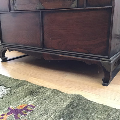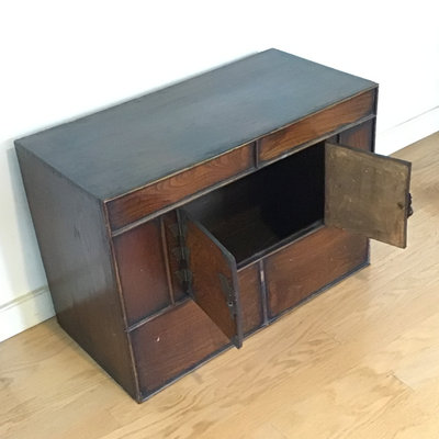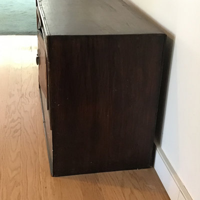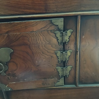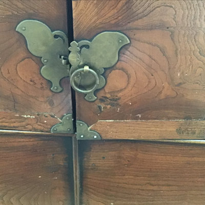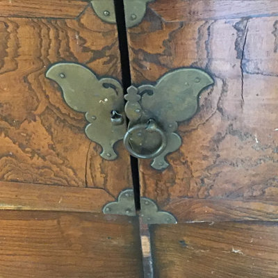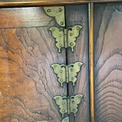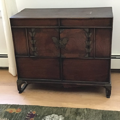Pair of Asian themed chests with hollow storage and brass butterfly hinges, one with base measures 16.5x33x28.5, one without base, 16.5x33x23. Base shows several cracks near the feet. Heavy, bring help and appropriate vehicle to pickup. 2 pieces.