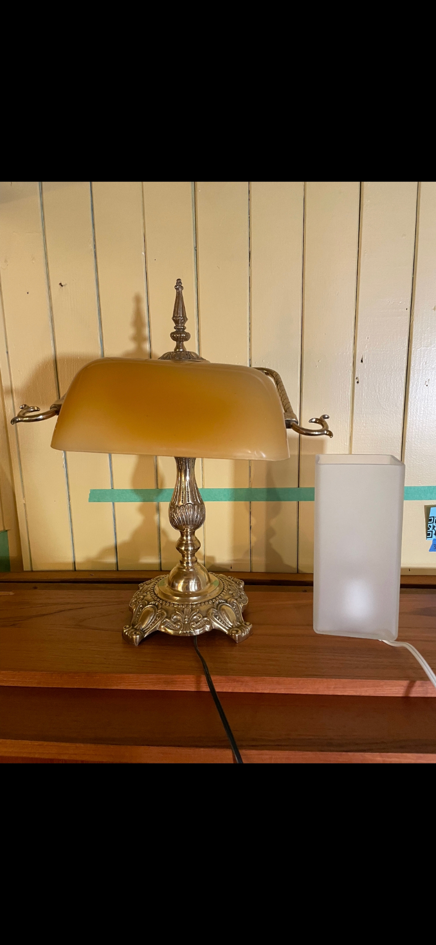An ornate brass bankers table lamp with an amber glass shade. Also shown is a frosted cube-style table lamp with a power cord and switch.