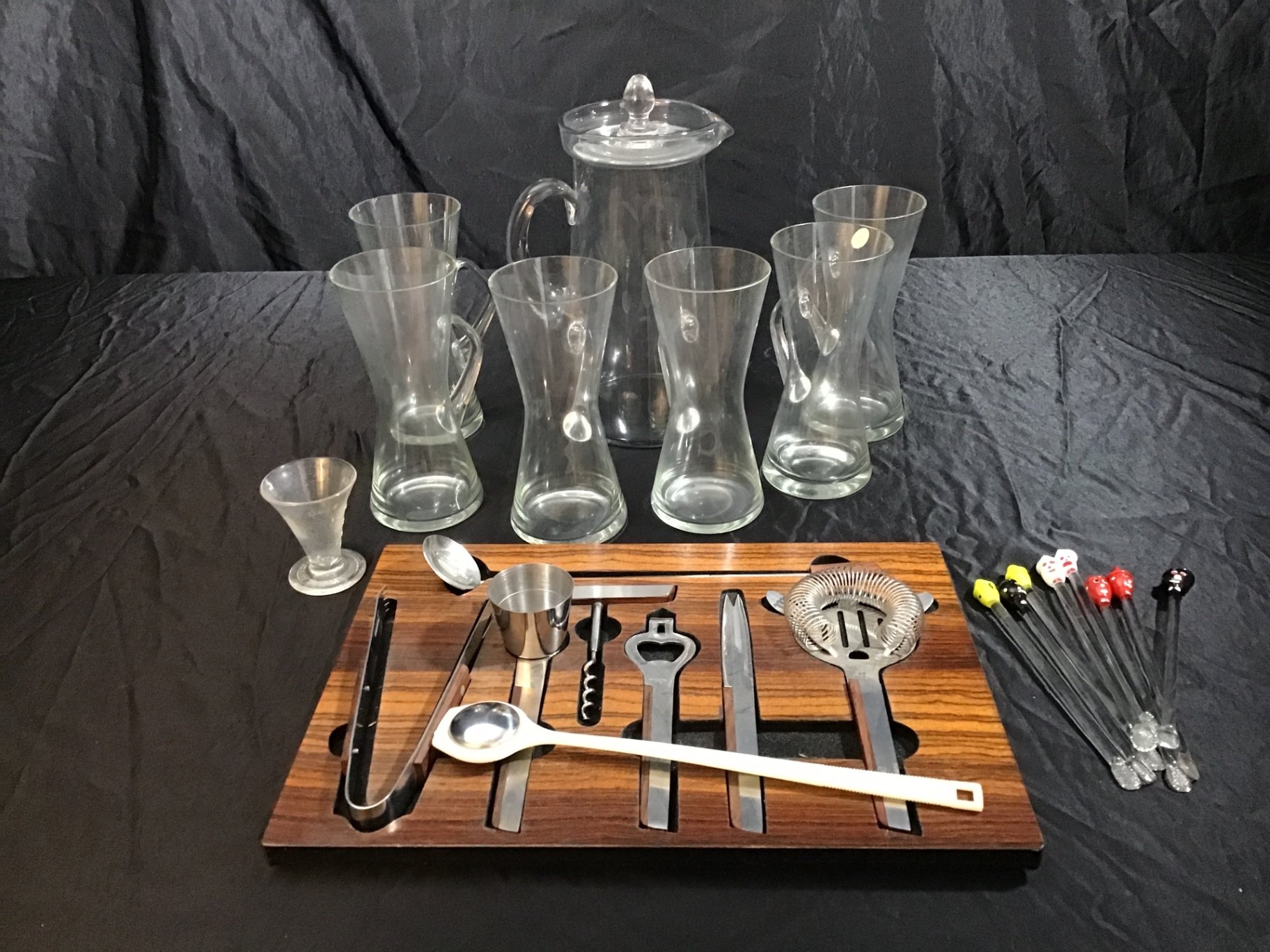 Vintage mid-century stainless steel bar tools in tray with additional ice breaker, made in Japan. Set of hour-glass shaped tankards, 7h. Etched glass pitcher with lid, 11h x 7w. Clown head glass cocktail stirrers. Vintage glass jigger. 18 pieces.