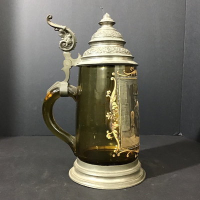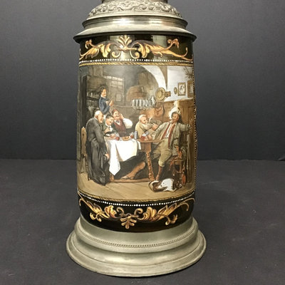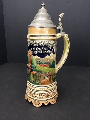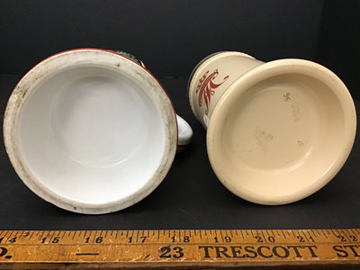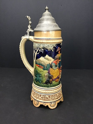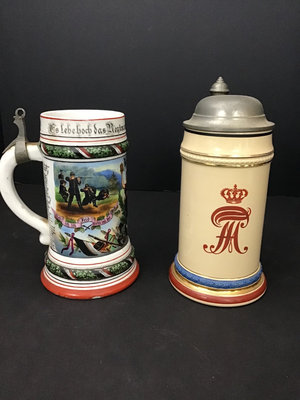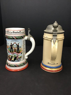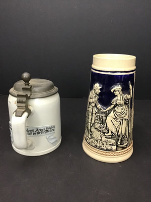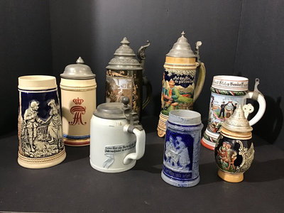 Vintage ceramic steins, 6h to 11.5h. One with working music box in bottom, tune is Whistle While You Work, 11.5h. Largest one is glass, 11.5h x 4d. One missing pewter lid, several have markings on bottom. 8 pieces.