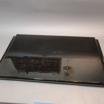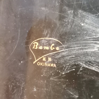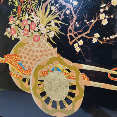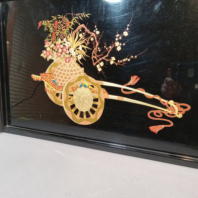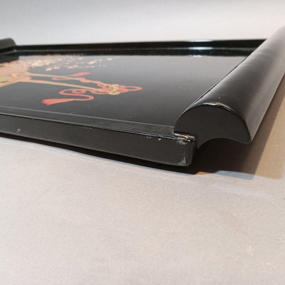 Large Bembo Okinawa lacquer tray, hand painted design on top, half-scroll handles. 25x14.5. 1 piece.