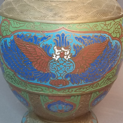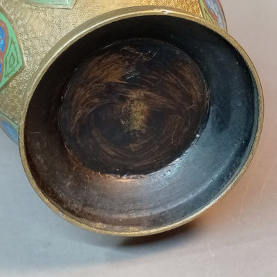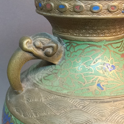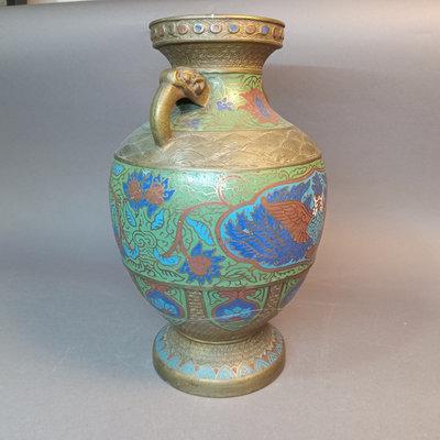 Vintage brass & cloisonne enameled vase, elephant trunk handle design. 12.25h x 8d Made in Japan. 1 piece.