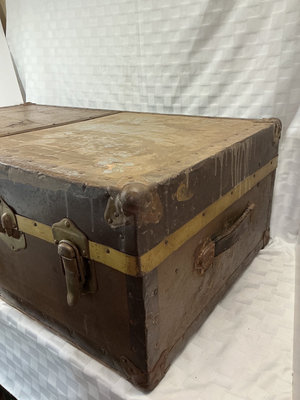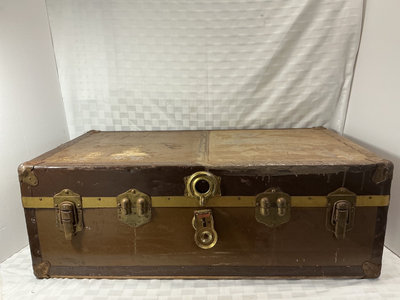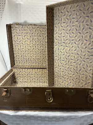 Vintage travel trunk with brass latches, corner protectors, and a central locking mechanism. Exterior shows wear; interior is lined with blue leaf-patterned fabric on both the lid and base. 36”x 22” x 12”. Military duffle bag.