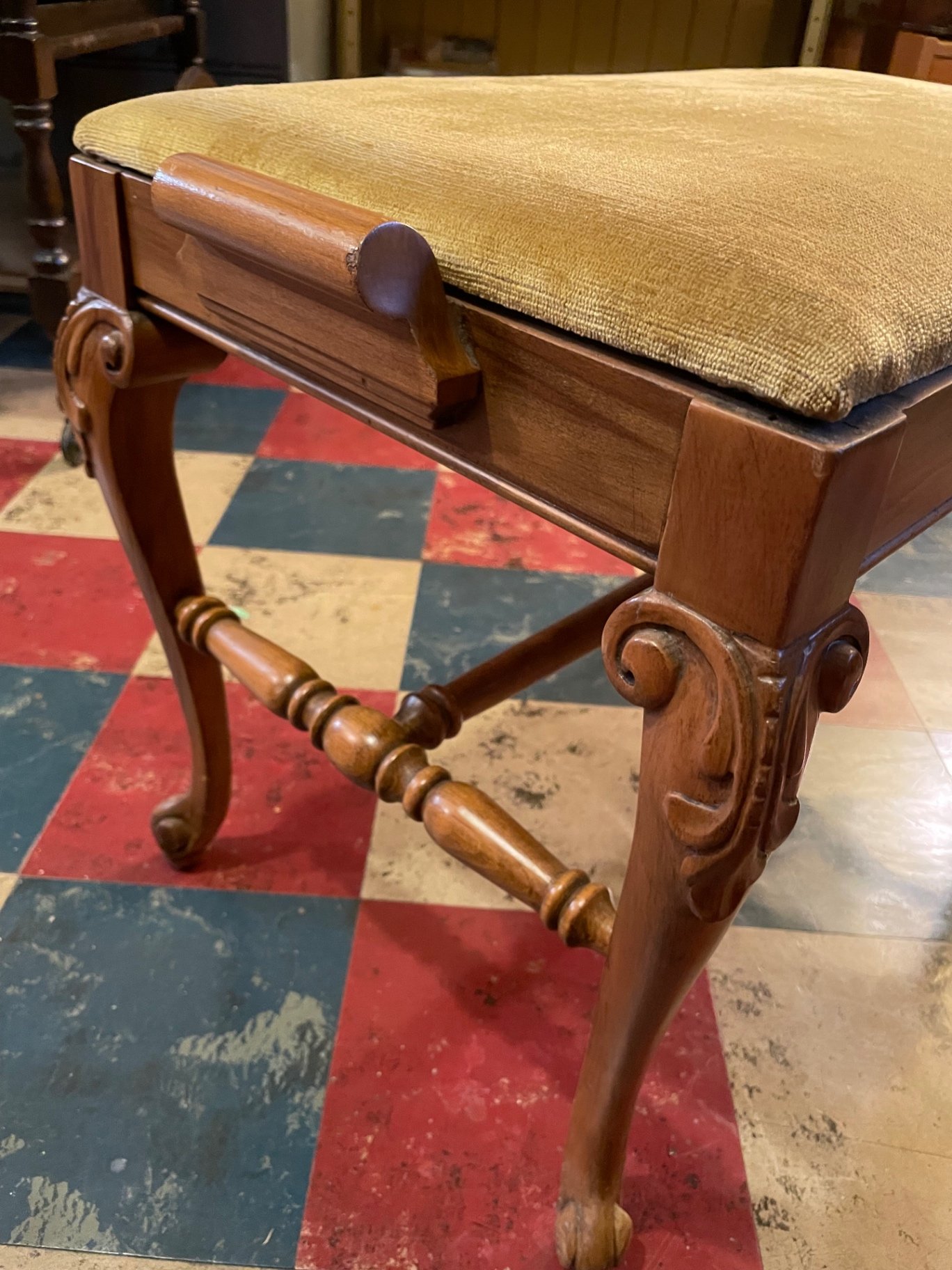 A vintage wooden bench (piano bench) with a padded textured fabric cushion. The piece features turned, scroll-accented legs, decorative side supports, and a central turned stretcher connecting the legs. 27w x 17d x 18h.