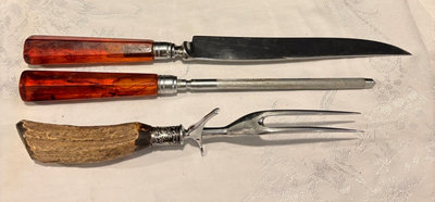 Just in time for the holidays! This beautiful set includes a knife, a knife sharpener, and carving fork.