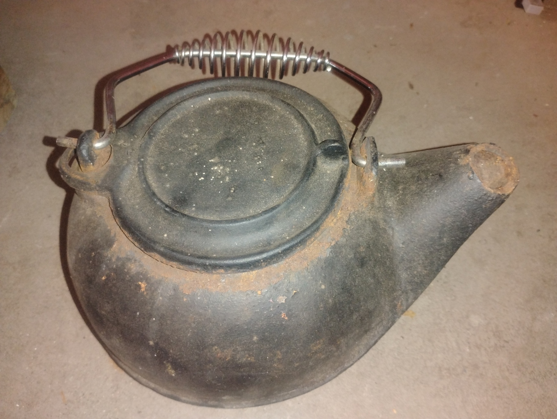 A round, black, cast-iron kettle/pot with a hinged spring handle and a short side spout; surface shows rust and wear.
