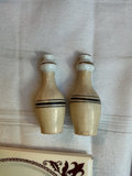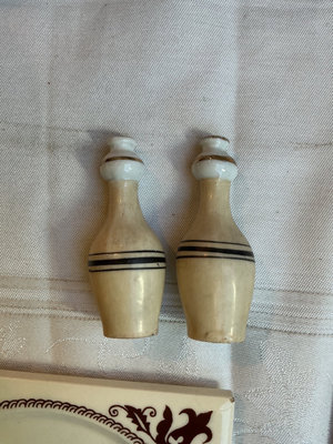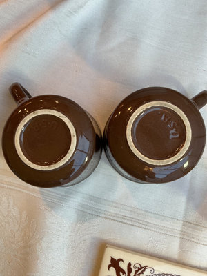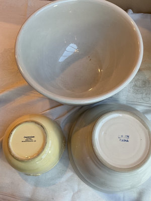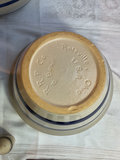 Three Roseville ceramic nesting mixing bowls, two similar from China, two brown ceramic USA cups and a few other small pieces.