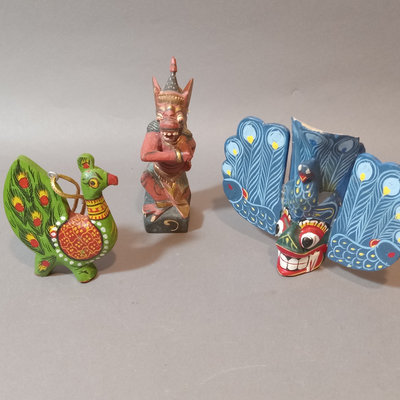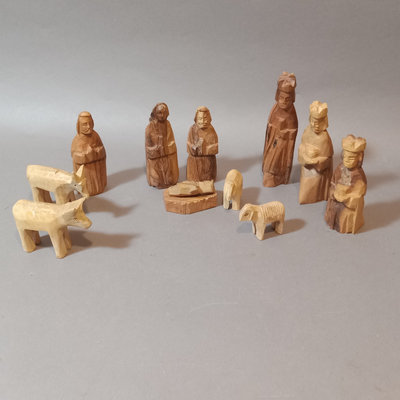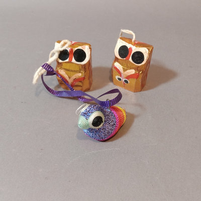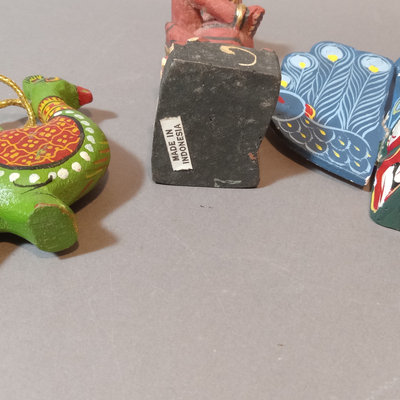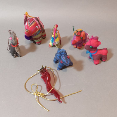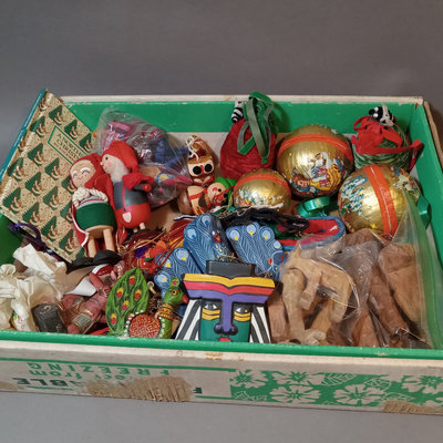 Paper ornaments, velvet pine cones, fabric animals, tiny shoes, painted wood figures from Nepal, and Africa. Scandinavian figures. Small book A Northern Christmas by Rockwell Kent. Hand carved wood nativity set, made in Israel. And more. 30 plus pieces.