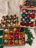 Glass ornaments, vintage bulbs, tinsel tree veil , handmade quilted house and stockings