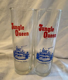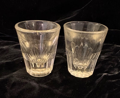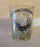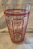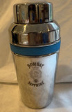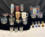Bombay Seagrams cocktail shaker made in Italy, vintage cocktail mixing glass with recipes, various logo glasses and Irish coffee mugs, vintage colored and crystal shot glasses.