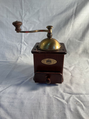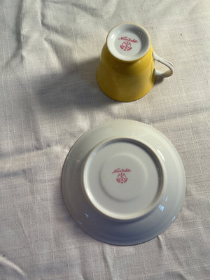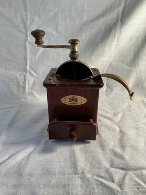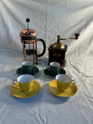 A collection of vintage coffee items including a manual coffee grinder, a copper-plated French press, and two Noritake porcelain cups with matching saucers in yellow and two Fondeville of England cups and saucers in green.